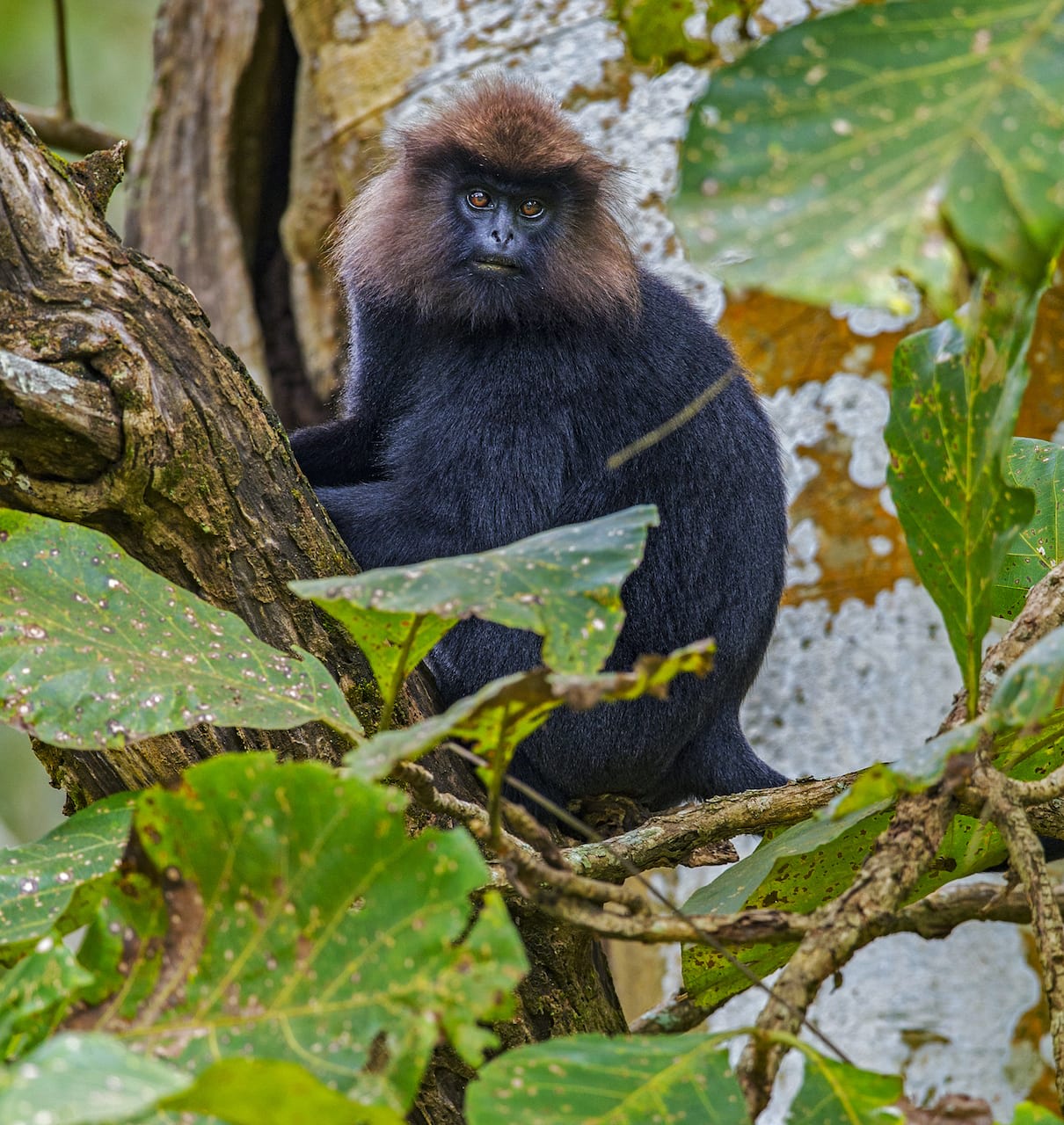 The glossy black Nilgiri langur (top), with a distinctive mane of grey, and the Malabar giant squirrel (above), with a coat of black, maroon, and cream, are among the many arboreal denizens of this forest. While langurs are mostly seen in troops of 9 to 12 individuals, the squirrel is usually solitary.