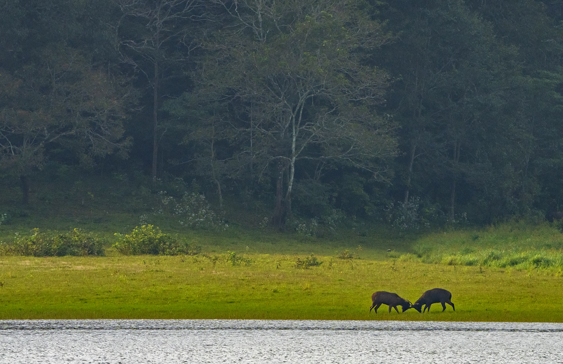The evening sky was overcast. Dressed in their impeccable white stockings, the largest bovines in the world leisurely munched on succulent grass along the shores of Periyar Lake. They swished their tails with unfailing regularity to keep insects at bay. Deep within the forest, time stood still as a larger herd hurried into the thickets. Thirty, fifty, hundred…it was impossible to tell how many gaur streaked past in a blur of brown and green. The thundering of their feet was the only sound in a forest awaiting a storm.