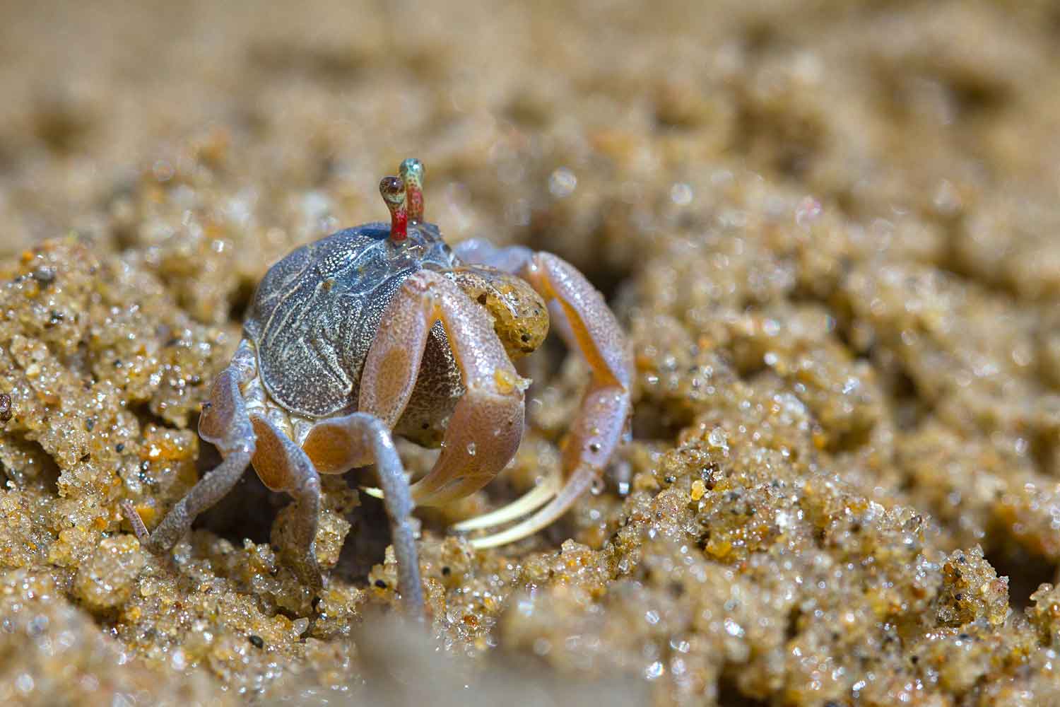 Standing amidst a colony of fiddler crabs (Austruca annulipes) feels like being on a miniature battlefield. These tiny crabs measure just over an inch in size. Males have one large claw (chela). They wave this claw during courtship displays — the motion gives an impression of playing a fiddle, giving this group their common name. The claw is also used for feeding and in combat with other males. If this dominant claw is lost in a fight, it starts regrowing from the next moult. In some species, the remaining smaller claw grows larger while the lost claw regrows into a smaller one.