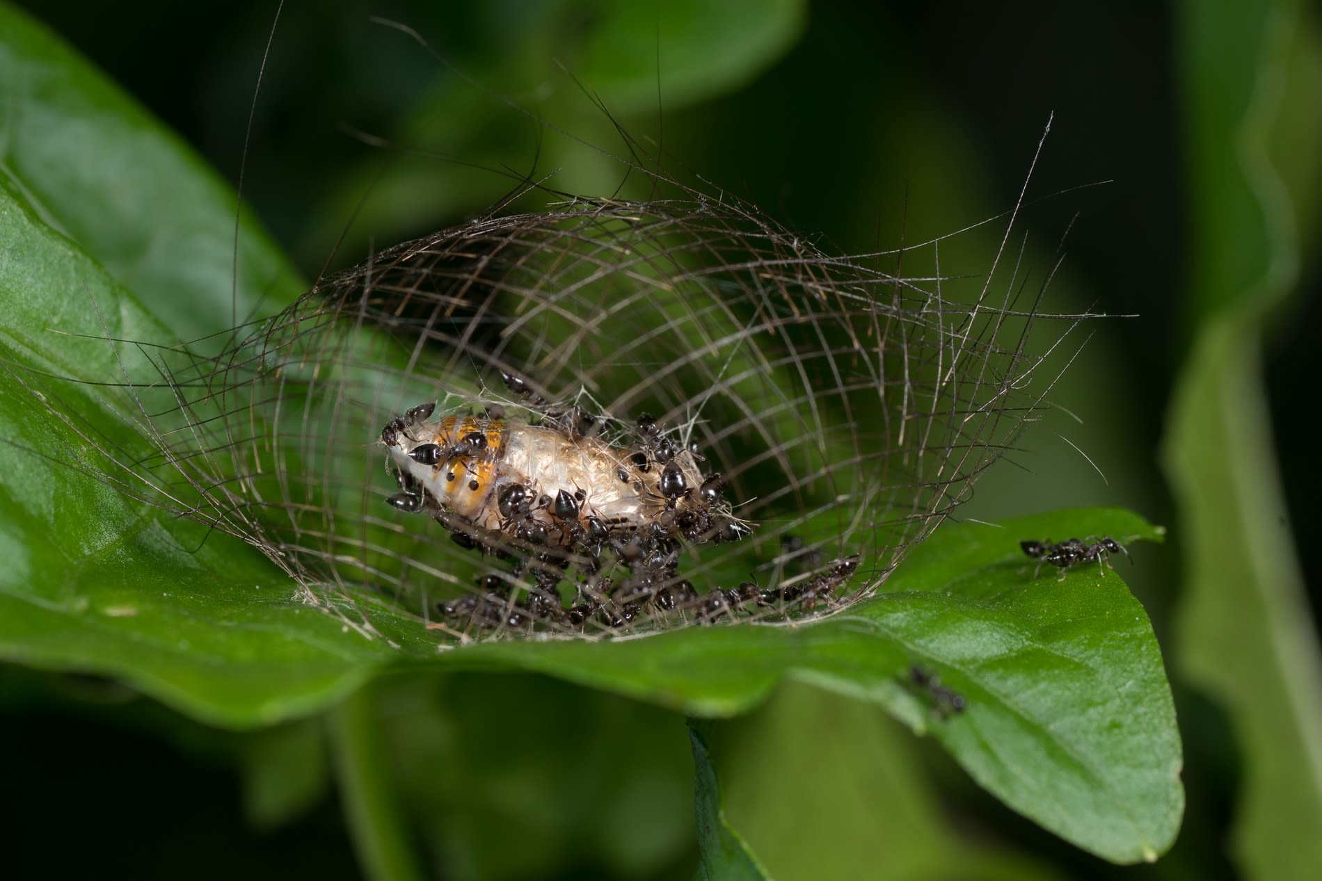 It seems unreal that a cryptic caterpillar chewing on leaves turns into a winged adult with beautiful patterns. Ultimately, the impetus for undergoing radical transformations is survival. Each stage of the lifecycle has defence strategies to fend off predators. The pupal cage is surprisingly tough and strong enough to deter most birds and parasitoid wasps. Unfortunately, some predators do break through these defences. Crematogaster ants, for instance, are known to invade developing pupae (top), while weaver ants, one of the most prolific predators (above), can gobble up entire adult bodies.