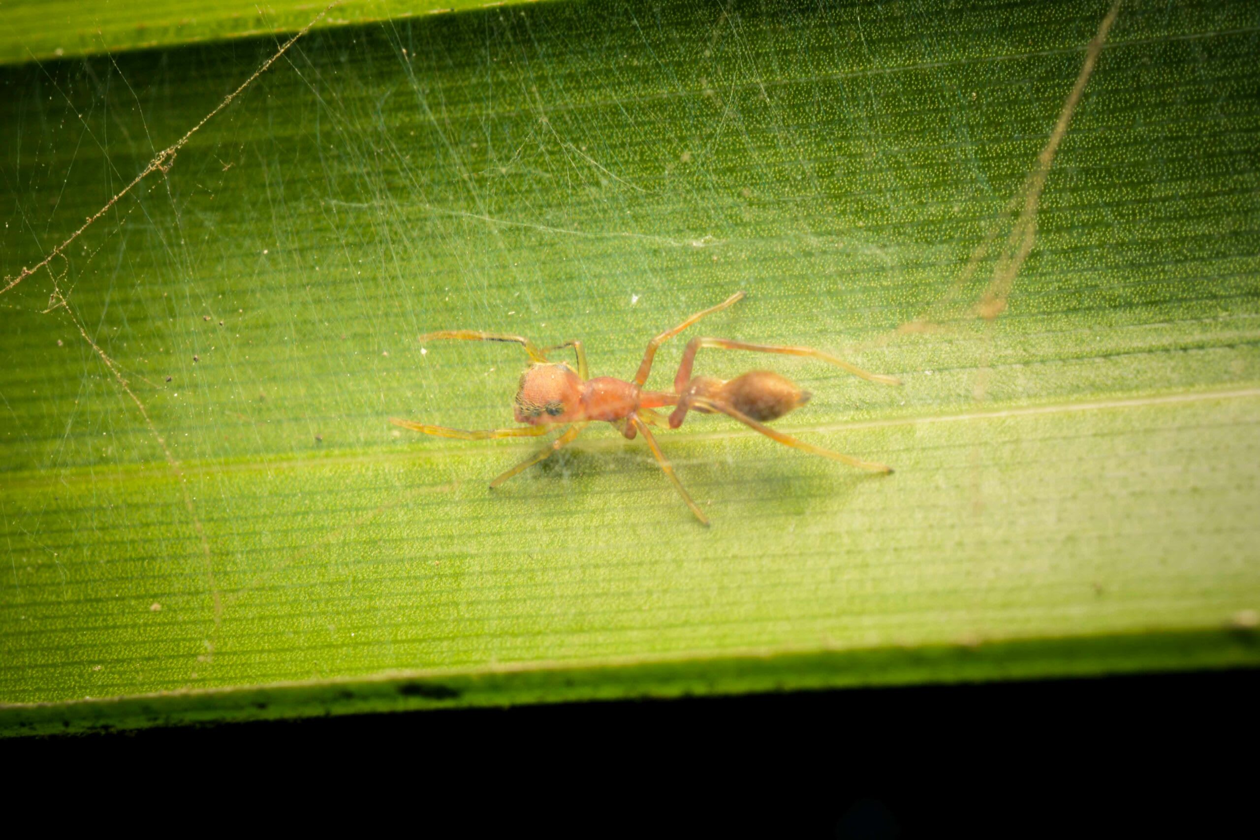 All spiders produce silk; even the ones that do not build webs. Jumping spiders, for instance, use silk for a variety of reasons: as a safety line when they are jumping from one spot to another; to create protective egg sacs; and to build safe retreats for themselves. Myrmarachne plataleoides, a species of jumping spider that mimics the weaver ant, typically build their retreats on the surface of leaves. They line the surface with a thick coating of silk creating an elongated igloo-like structure. The spider then uses this silken refuge to rest when it is moulting (sheds its skin). In a rather bizarre turn of events, I found an M. plataleoides setting up its silken retreat inside an abandoned plastic soap cover. The crumbling plastic packaging presented the spider with a rather secure space with minimal entry points for aerial predators like wasps.