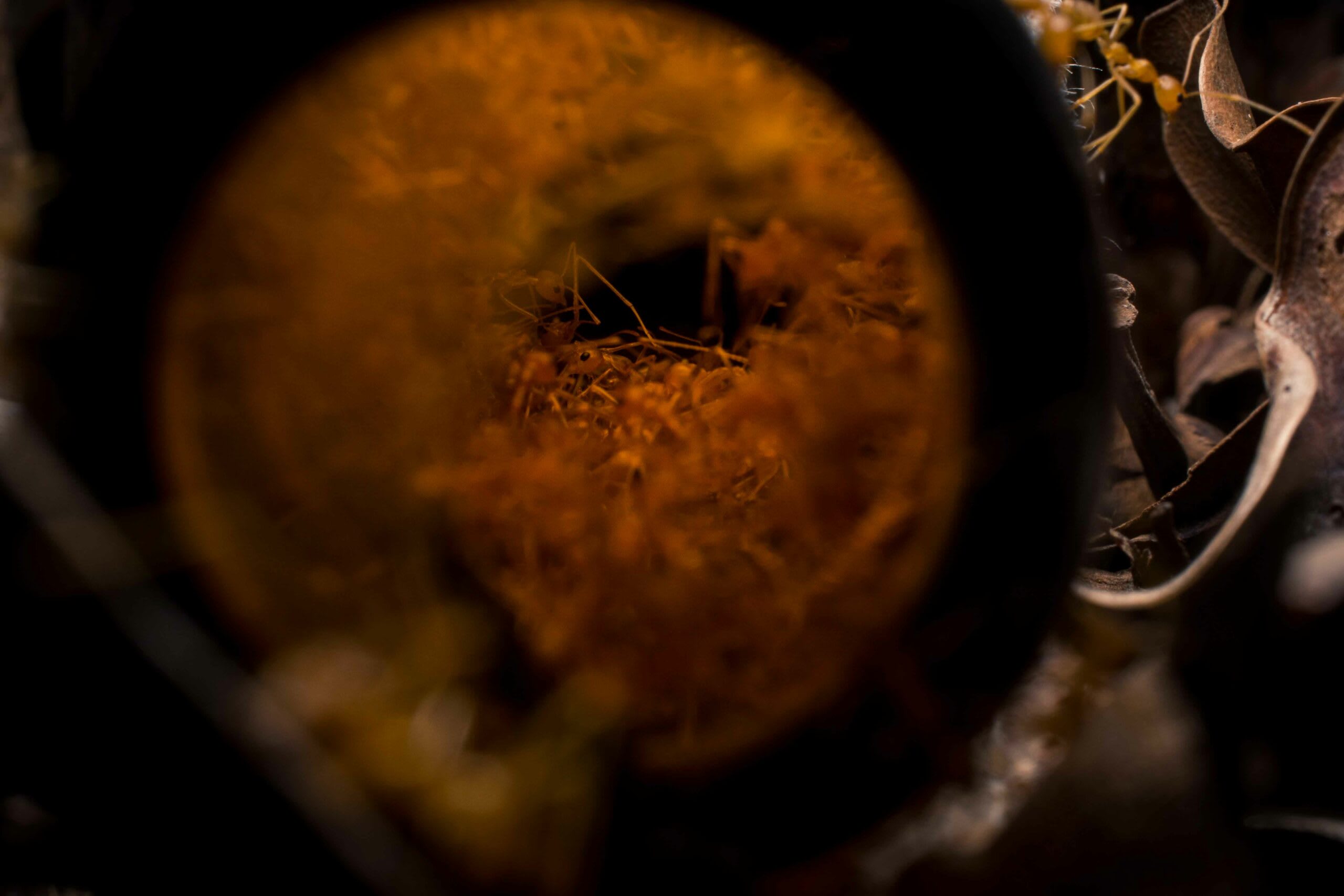 Weaver ants (Oecophylla smaragdina) are one of the most dominant creatures on Earth. They grow into colonies of up to half a million ants that take over tropical forest canopies with leafy strongholds. These great queendoms in the canopy have humble beginnings, with a mated queen usually finding a quiet crevice to lay her first clutch of eggs. On a remote beach on Havelock Island in the Andamans, we stumbled upon a vast patch of garbage that appeared to have washed ashore from lands far and near. About 20 metres from the shoreline, I saw a beer bottle that looked rather animated on the inside. A closer look revealed nearly a hundred curious eyes and antennae pointed in my direction. The abandoned beer bottle was the founding site of a new weaver ant colony. The translucence of the bottle presented an inside view of the rows and rows of eggs and helpful worker ants tending to them. From the mouth of the bottle, multiple lines of ants explored their surroundings; some had even begun the construction of leafy nests on nearby trees. Cover photo: Weaver ants emerge from a nest they created inside a discarded glass beer bottle. The bottle was a safe haven for the weaver ant queen to begin her colony.