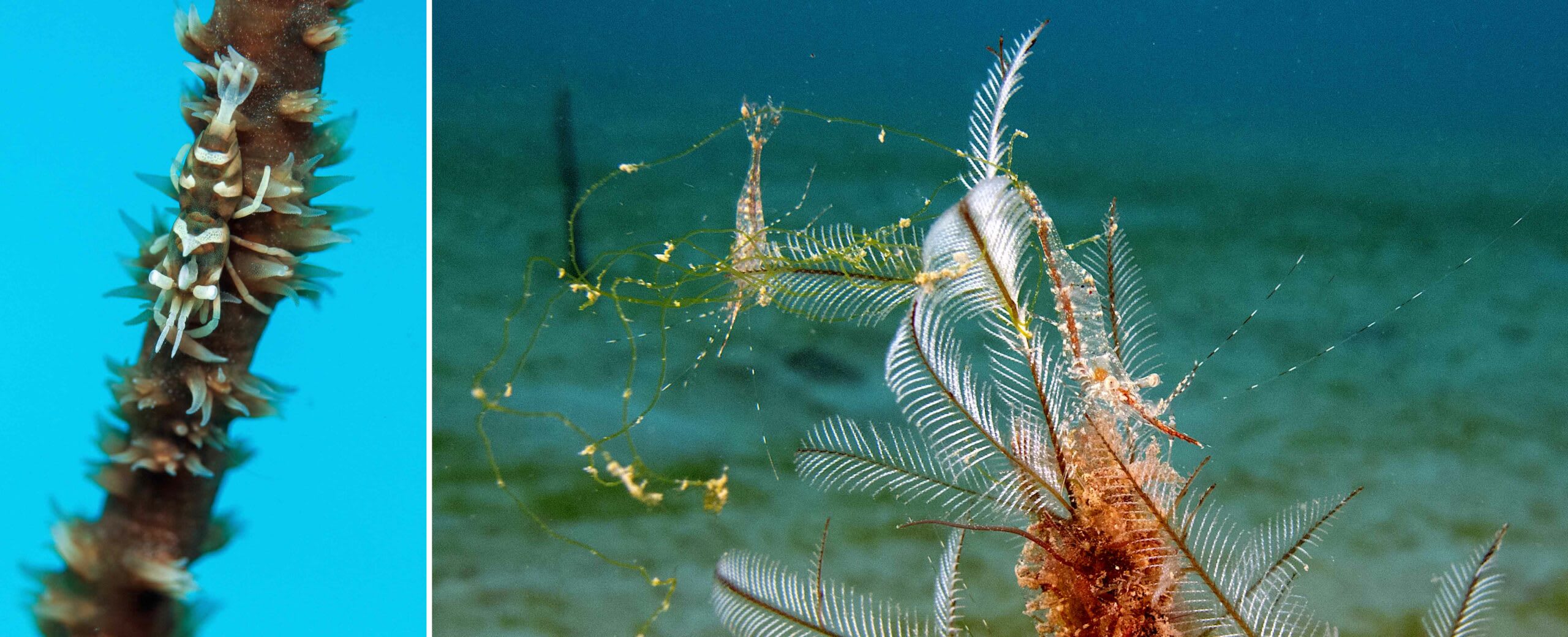 Cleaner shrimps have an opportunistic diet consisting largely of organic matter flaking off other animals. Choosing either fixed or sedentary hosts offers them a permanent home in whip corals and soft corals (top left and above right) and shelter from predators — like the underside of a cushion star that will rarely see the light of day (above left). The most extraordinary outcome of these associations is the shrimp’s ability to go incognito. Most cleaner shrimps are a challenge to spot because of how well they blend in with their hosts in colour, texture, and behaviour. The whip coral shrimp (Pontonides, top left), sea star shrimp (Periclimenes soror, above left), cleaner shrimp (Caridae, above right), and hydroid shrimps (top right) are a few examples of the incredible coevolution between shrimps and their hosts. Photos: Umeed Mistry (top left, above), Vikas Nairi (top right)
