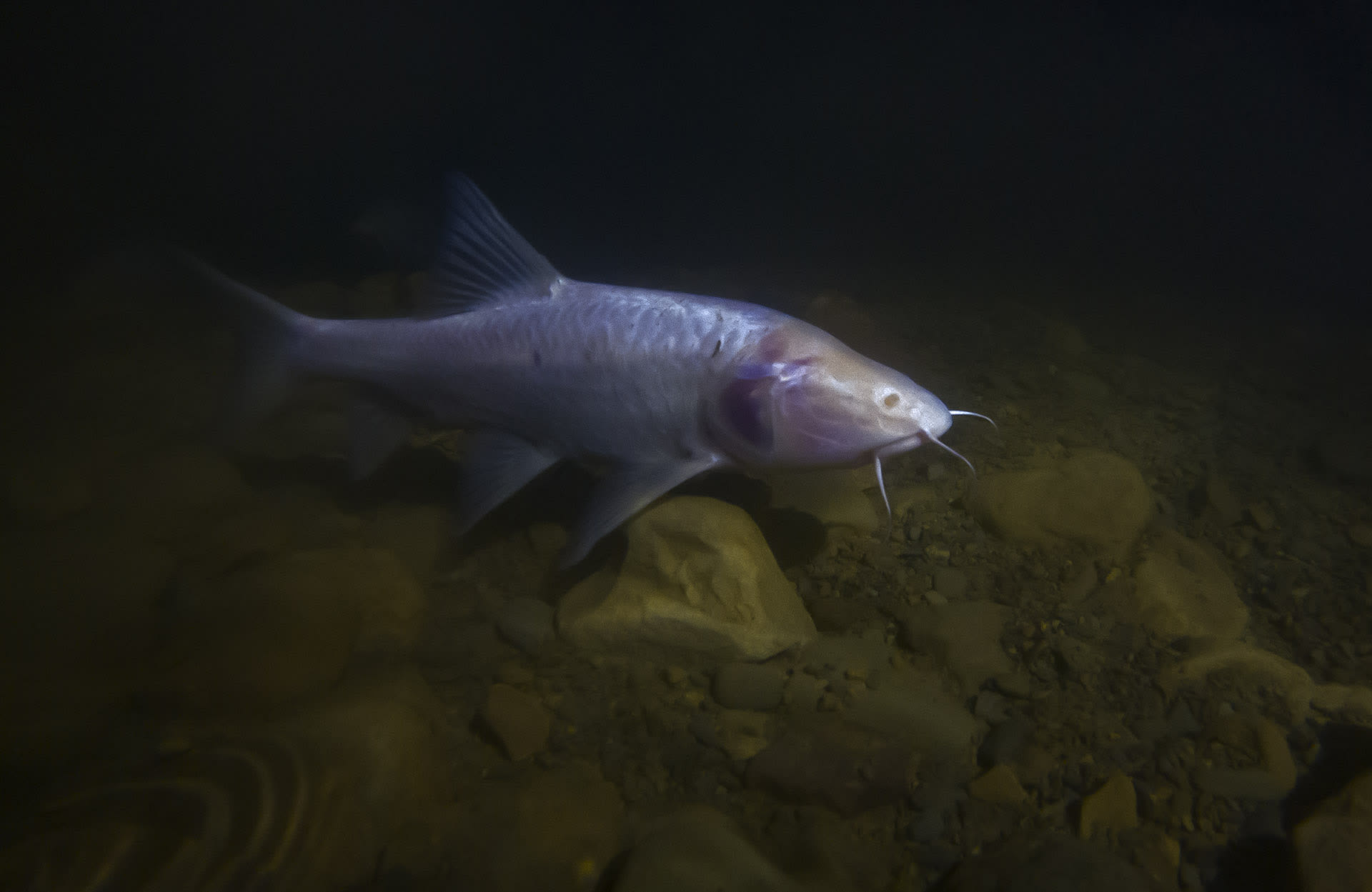 Inside a cave, you never know what you might find. A lucky caver might see spectacular aquatic life. In Krem Umladaw, for instance, we saw the world’s largest blind fish (top) at a depth of almost 115 metres below the surface. Completely blind and without pigment, these rare fish, possibly a variant of the mahseer, can sense movement. In other unnamed caves, our team spotted freshwater fish like the orangefin labeo (Labeo calbasu) (above left) and Bengal loach (Botia dario) (above right).