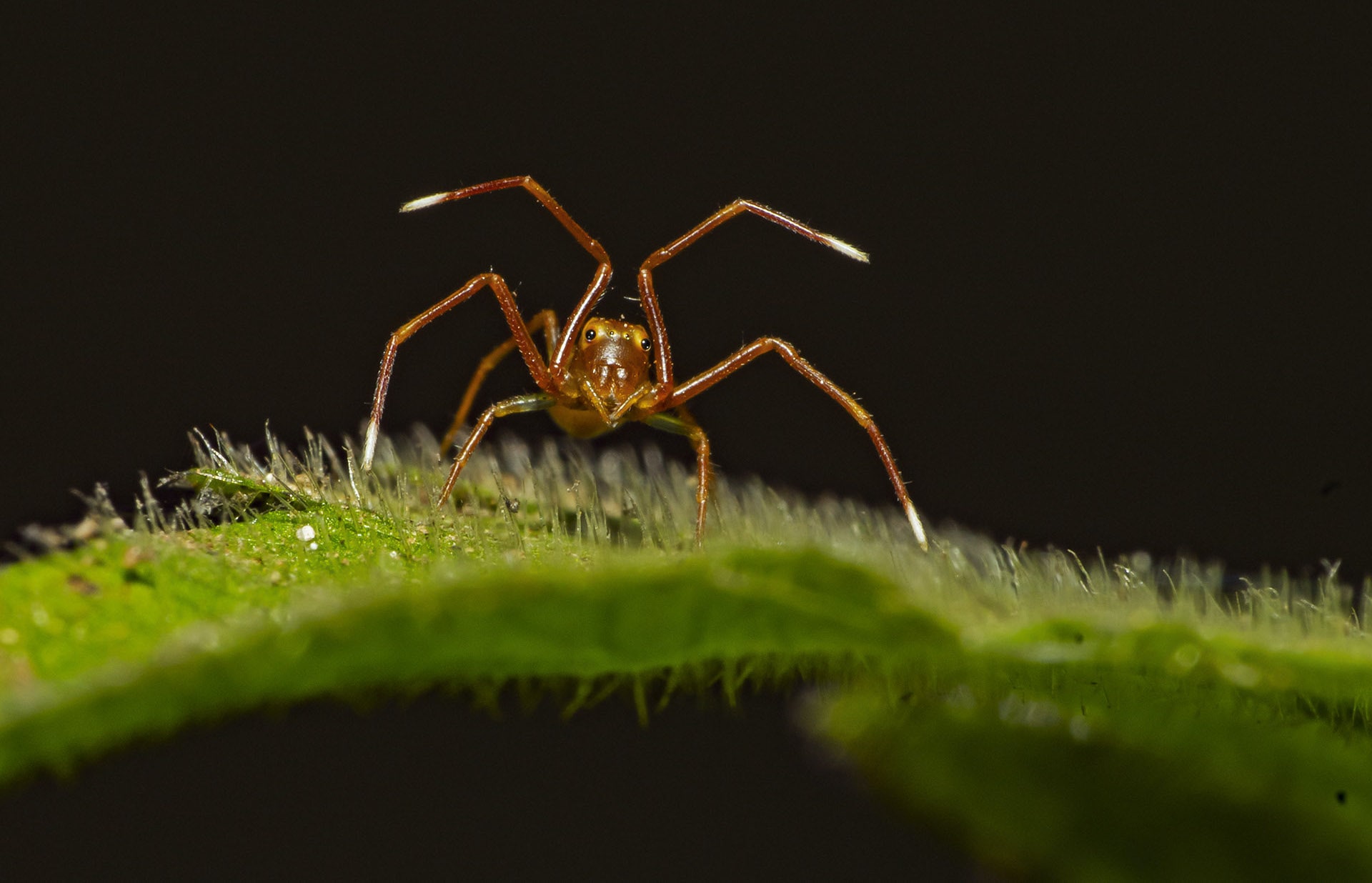 Caves are also home to many different kinds of spiders. (Left) A giant huntsman spider in an unnamed cave near Lumsnang, Meghalaya. Huntsman spiders are carnivorous, feeding primarily on insects and other invertebrates in the cave. (Left) Insect life at the entrance of Krem Chympe is abundant. This ant-mimic crab spider was spotted in the foliage just outside.