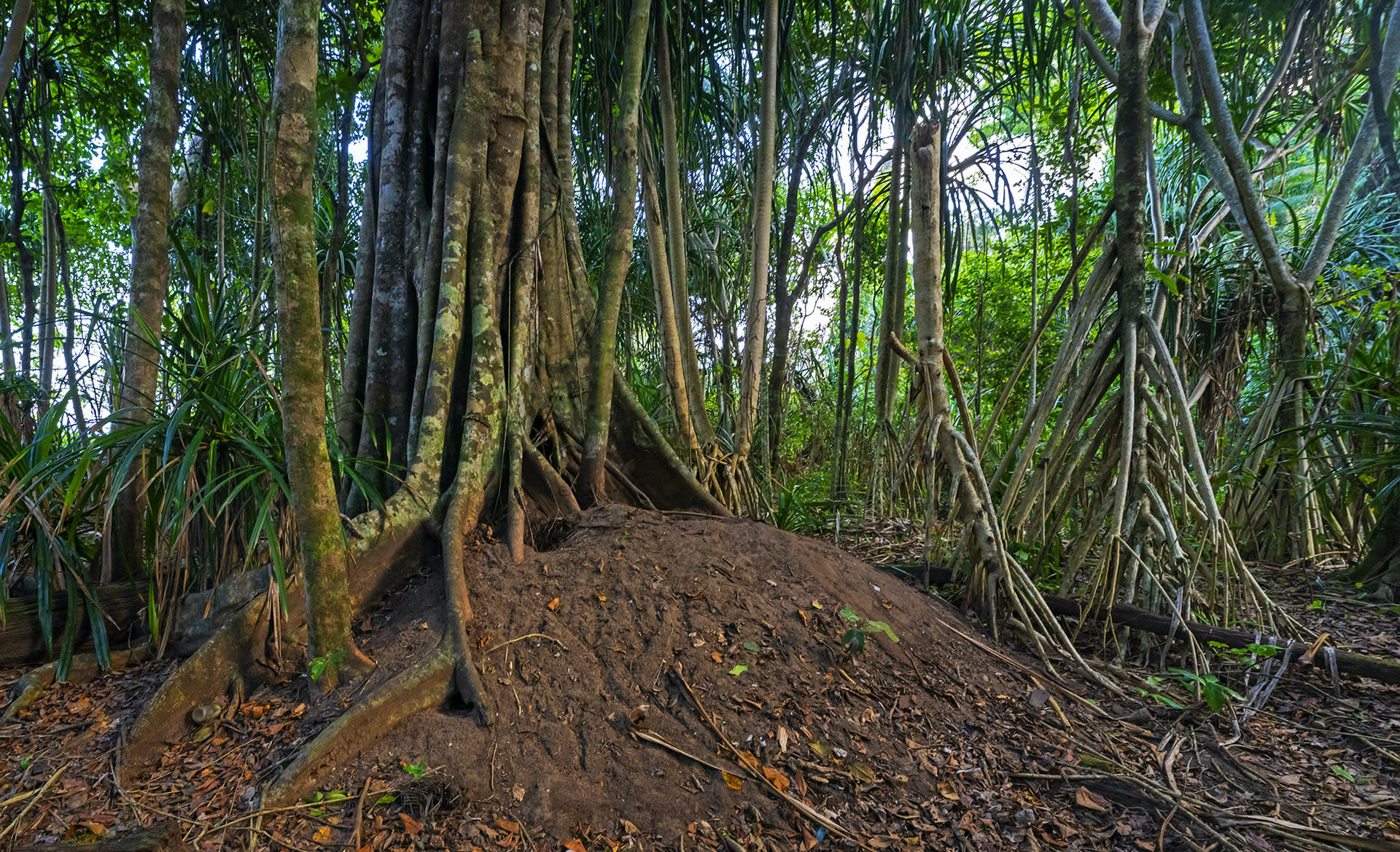 At first glance, the Nicobar megapode looks like an ungainly, stocky brown chicken with large feet. Megapode literally means “big foot”. This ground-dwelling bird nests in a unique way. Instead of incubating its eggs with body heat, it builds a mound of sand, corals, and dry leaves. At the heart of it, in a burrow lined with leaves, it lays salmon-pink eggs. As the vegetation rots, the nest heats up like compost, and incubates the eggs. Built on top of one another over the years, old mounds can tower over six feet high and wide as a tennis court.