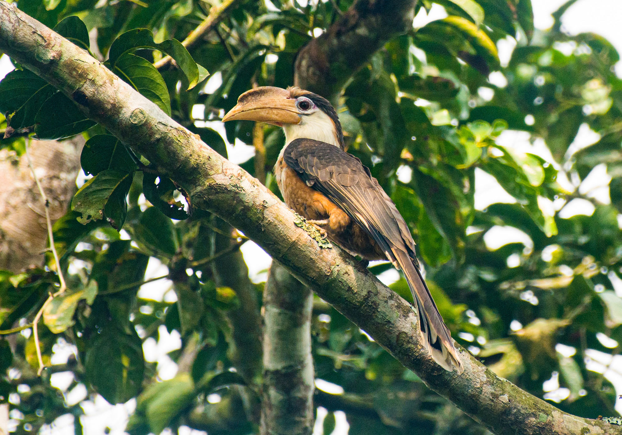 It was an afternoon in mid-January, and the rainforest was silent but for the continuous sound of the crickets, cicadas, and the occasional clicking calls of a black giant squirrel. Suddenly, we heard inane chuckles that transcended into a variety of loud squeals, cackles, and piercing yawps coming from high up in the canopy of emergent winged-seeded (Dipterocarpus) trees. The shrieks became louder as we went closer; they didn’t sound like anything we had heard in a month of walking in the dense rainforests of Upper Brahmaputra valley in Assam. Our field assistants confirmed that these calls were of the white-throated brown hornbills (Anorrhinus austeni), birds we had been on a lookout for since our first day in these forests. There they were, at least four of them, perched on the higher branches of an acorn (Castanopsis) tree. I finally had a clear glimpse. We watched them as they preened and regurgitated seeds of fruits they must have eaten earlier in the day, until they swiftly flew away, almost disappearing into the forest canopy. The forest was still again, but their calls echoed in our ears for a long time after.