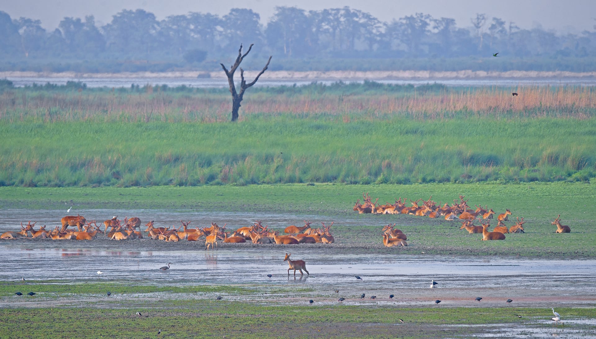 The marshy grasslands of Dudhwa Tiger Reserve are interspersed with rivers, shallow lakes, and swamps that create a lush green landscape and provide fresh water all year round. (Top) Jhadi taal located in Kishanpur Wildlife Sanctuary is a safe haven for numerous species from (top) the swamp deer. (Above) Herds of elephants can be seen in Banke taal inside Dudhwa National Park.
