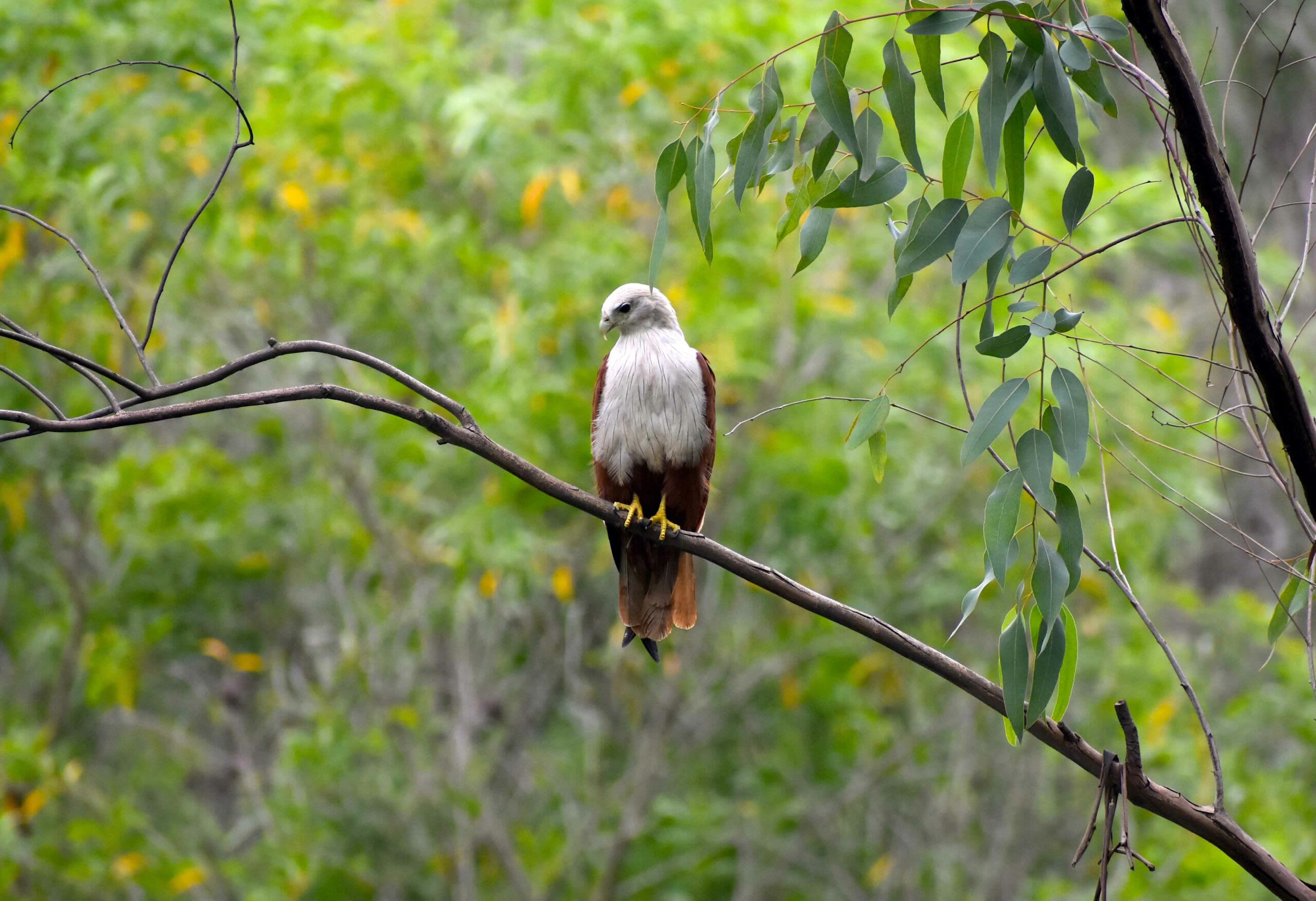The sharp, sweet tunes of sunbirds and the trills of tailorbirds, tits, flowerpeckers, white-eyes and prinias herald the arrival of dawn. This musical mixed spcies flock moves hectically from thicket to thicket, making the most of the early hours. Other minstrels include: bulbuls with their five-note call; barbets — both coppersmith and white-cheeked, with their staccato calls; shrill drongos who often mimic other vocalists; coucals’ throaty notes as they skulk in the undergrowth; and the subdued coos of spotted and little doves. The less melodic songs issue from harsh-throated crows, raucous mynas, chuckling treepies, strident grey francolins. The shikra with its piercing notes becomes more jubilant if the morning hunt is successful. As the sun rises overhead, wheeling black kites command the skies, and the occasional Brahminy kite, honey buzzard, or greater steppe eagle join their ranks. Along the edges of the forest, black-shouldered kites and Indian rollers patrol the farmlands, uttering infrequent shrill cries, and the whistling bushchats and chirping pipits dart around in search of insects.